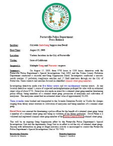 On August 15, 2008, from 0700 hours to 1200 hours, detectives with the Porterville Police Department’s Special Investigations Unit (SIU) and the Tulare County Probation Department conducted a citywide anti-Gang Suppression Detail. Investigators conducted a narcotic search warrant, 15 probation compliance searches and 15 field interviews through out the City of Porterville. These contacts and searches focused on identified criminal street gang members.