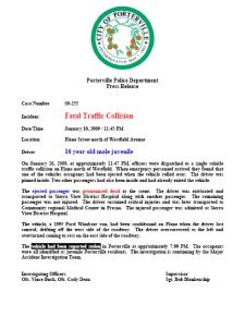 On January 10, 2009, at approximately 11:47 PM, officers were dispatched to a single vehicle traffic collision on Plano north of Westfield. When emergency personnel arrived they found that one of the vehicles occupants had been ejected when the vehicle rolled over. The driver was pinned inside. Two other passengers had also been inside and had already exited the vehicle.